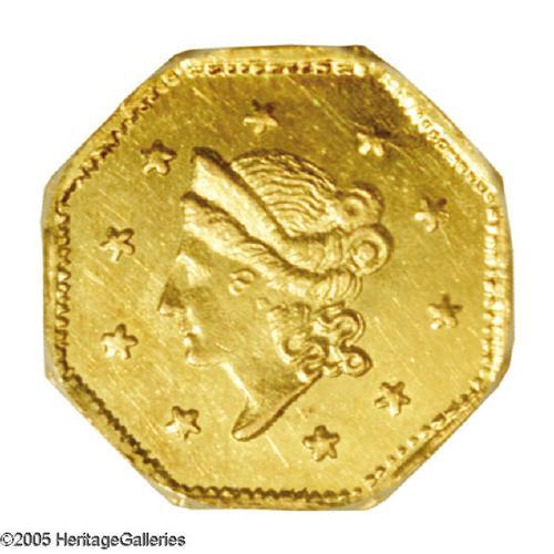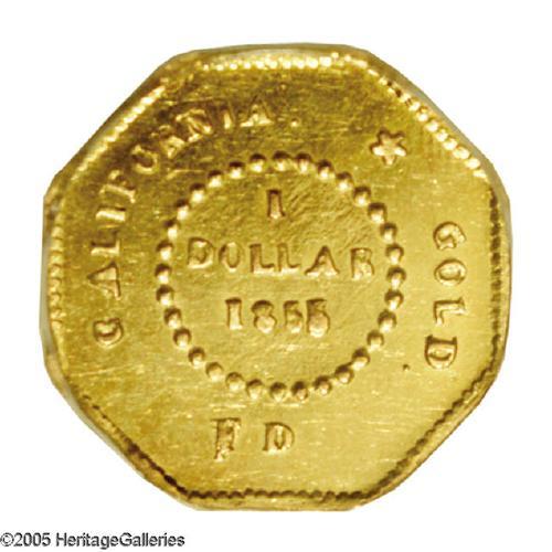 <B>1855/4<$1> Liberty Octagonal 1 Dollar, BG-511, High R.4, MS62 NGC.</B></I> Frontier & Deviercy dollar with crude, tiny overdate, off-center FD on reverse. The fields are bright and deeply mirrored with a moderate amount of mint frost on the devices which gives the coin a mild cameo appearance.