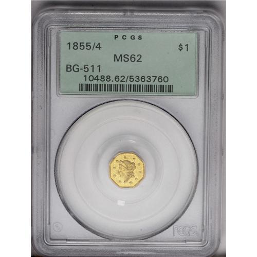 <B>1855/4<$1> Liberty Octagonal 1 Dollar, BG-511, High R.4, MS62 PCGS.</B></I> Rich honey-gold toning dominates, although glimpses of yellow-green color are present here and there. Period One octagonal dollars are a coveted category within the small denomination gold series.