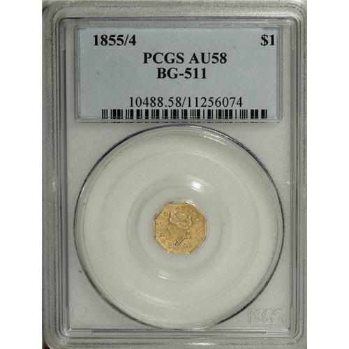 <B>1855/4 $1 Liberty Octagonal 1 Dollar, BG-511, High R.4, AU58 PCGS.</B></I> A satiny almond-gold example whose smooth surfaces and well struck motifs give this piece the eye appeal of a finer grade.<BR><BR><b>Shipping:</b> Coins & Currency (<a target="_blank" href="http://www.heritageauctions.com/common/shipping.php">view shipping information</a>)