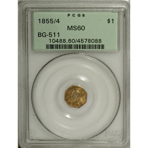 <B>1855/4 $1 Liberty Octagonal 1 Dollar, BG-511, High R.4, MS60 PCGS.</B></I> Die State II, with Liberty's nose broken (as made) due to exuberant die polishing. Golden-brown and mauve patina enriches this bright example. An interesting lintmark (as produced) rests below the first star. Thin vertical marks are noted on the portrait and star 7. Certified in a green label holder.<BR><BR><b>Shipping:</b> Coins & Currency (<a target="_blank" href="http://www.heritageauctions.com/common/shipping.php">view shipping information</a>)