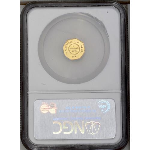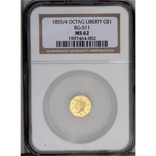 <B>1855/4<$1> Liberty Octagonal 1 Dollar, BG-511, Low R.4, MS62 NGC.</B></I> Nicely defined with somewhat reflective luster. The surfaces show evidence of imperfect workmanship, as usually seen, and shallow abrasions on both sides account for the grade.