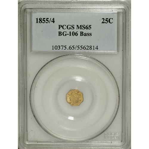 <B>1855/4 25C Liberty Octagonal 25 Cents, BG-106, R.3, MS65 PCGS.</B></I> Ex: Bass. Die State III with a lapped portrait. A satiny yellow-gold Gem of this popular Period One variety. The obverse exergue has faint laminations, as issued. Population: 6 in 65, 2 finer (3/07).<BR><I>Ex: Harry W. Bass, Jr. Collection (Bowers and Merena, 5/99), lot 2504.</B></I><BR><I>From The Diamond K Collection of California Fractional Gold.</B></I><BR><BR><b>Shipping:</b> Coins & Currency (<a target="_blank" href="http://www.heritageauctions.com/common/shipping.php">view shipping information</a>)