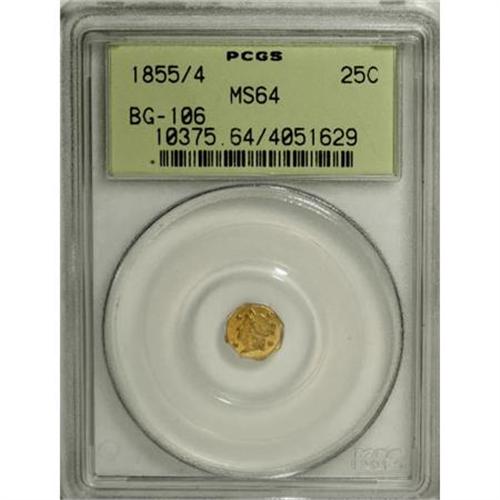 <B>1855/4 25C Liberty Octagonal 25 Cents, BG-106, R.3, MS64 PCGS.</B></I> PCGS Population (34/8). NGC Census: (8/1). (#10375)<BR><BR><b>Shipping:</b> Coins & Currency (<a target="_blank" href="http://www.heritageauctions.com/common/shipping.php">view shipping information</a>)