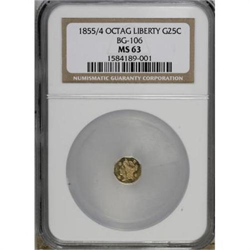 <B>1855/4 25C Liberty Octagonal 25 Cents, BG-106, R.3, MS63 NGC.</B></I> NGC Census: (3/11). PCGS Population (41/44). (#10375)<BR><BR><b>Shipping:</b> Coins & Currency (<a target="_blank" href="http://www.heritageauctions.com/common/shipping.php">view shipping information</a>)