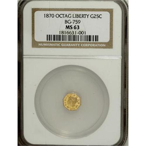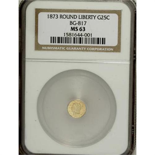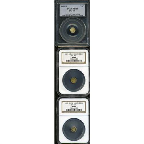 <B>1855/4 25C Liberty Octagonal 25 Cents, BG-106, R.3, MS63 PCGS,</B></I> almond-gold toning, mint-made die rust on the neck;<B> 1870 Liberty Octagonal 25 Cents, BG-759, R.4, MS63 NGC, </B></I>peach-gold toning with hints of gunmetal-blue; and an <B>1873 Liberty Round 25 Cents, BG-817, R.3, MS63 NGC, </B></I>undisturbed fields,<B> </B></I>slight sinking in the reverse center from metal flow to the portrait.<B><BR></B></I><BR><BR><b>Shipping:</b> Coins & Currency (<a target="_blank" href="http://www.heritageauctions.com/common/shipping.php">view shipping information</a>)