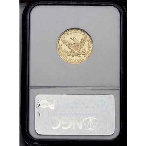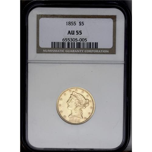 <B>1855<$5> AU55 NGC.</B></I> A still-lustrous amber example with light highpoint wear on either side. Boldly struck with handling marks in the fields that are consistent with light circulation.