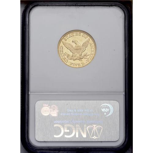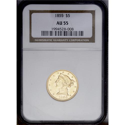 <B>1855<$5> AU55 NGC.</B></I> The last 5 in the date touches the truncation of the bust on this example. Much luster remains on this light yellow-gold piece, and no overly distracting abrasions are present. An appealing example, high-end for the assigned grade. <BR><BR><B>Important notice:</B> Heritage usually auctions material at the rate of 200-250 lots per hour. On some occasions eBay Live bid software or the Internet may not be able to keep up with the pace of the auction. We recommend placing a realistic absentee bid now as insurance to avoid disappointment. Occasionally the auctioneer may eliminate or reject an eBay Live bid, and the auctioneer may also reopen a lot after the close of the eBay live bidding (usually because we missed an audience bid), and may reject your bid even if it shows you as the winning bidder. By bidding via eBay Live, you agree that Heritage may award the lot to another bidder at its sole discretion under the circumstances described above or any other reasonable circumstances. Since eBay bids are not shown to us until we open the lot on the floor, we treat those bids just like floor bids. In most cases the floor responds before the eBay bid is presented to us, due to Internet lag time, so for consistency we have made it a policy that floor bids are always considered first over tie eBay live bids. Also please note that all Heritage lots purchased through eBay Live carry a 20% Buyer's Premium. Please make sure you read the Terms and Conditions before you bid. This lot is being auctioned in conjunction with a live floor auction by Heritage Galleries & Auctioneers. All final auction and invoice information will be supplied by Heritage Galleries & Auctioneers, and all other information should be considered preliminary. Lot:2726 <BR><BR><B>Winning Notification and Billing:</B> After the FINAL session in this auction is complete, Heritage will send e-mail and snail mail invoices. This process normally takes several days. All final auction and invoice information will be supplied by Heritage Galleries & Auctioneers, and all other information should be considered preliminary. <BR><BR>This auction will be conducted on a live auction floor and over the Internet through eBay Live. If you choose to place an absentee bid, please take a moment to <font color='#0000ff'><u><a href='http://pages.ebay.com/liveauctions/help/before/laabsentee.html'>learn how eBay Live absentee bidding works</a></u></font><font color='#000000'>