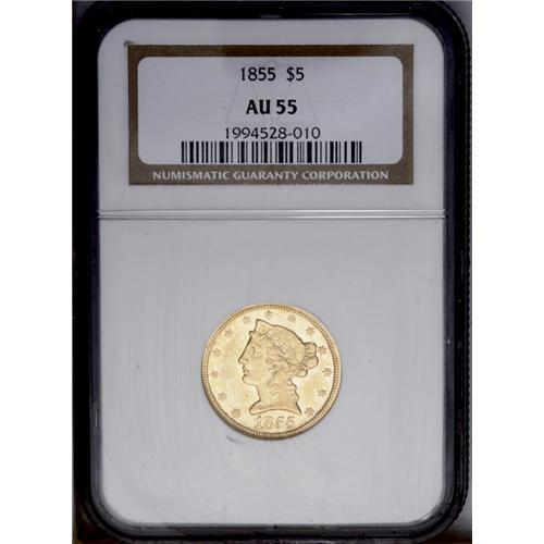 <B>1855<$5> AU55 NGC.</B></I> Typical strike weakness on this piece is seen on the eagle's claws and arrow feathers. The moderately lustrous surfaces show myriad small abrasions consistent with the grade, more prominently on the obverse. <BR><BR><B>Important notice:</B> Heritage usually auctions material at the rate of 200-250 lots per hour. On some occasions eBay Live bid software or the Internet may not be able to keep up with the pace of the auction. We recommend placing a realistic absentee bid now as insurance to avoid disappointment. Occasionally the auctioneer may eliminate or reject an eBay Live bid, and the auctioneer may also reopen a lot after the close of the eBay live bidding (usually because we missed an audience bid), and may reject your bid even if it shows you as the winning bidder. By bidding via eBay Live, you agree that Heritage may award the lot to another bidder at its sole discretion under the circumstances described above or any other reasonable circumstances. Since eBay bids are not shown to us until we open the lot on the floor, we treat those bids just like floor bids. In most cases the floor responds before the eBay bid is presented to us, due to Internet lag time, so for consistency we have made it a policy that floor bids are always considered first over tie eBay live bids. Also please note that all Heritage lots purchased through eBay Live carry a 20% Buyer's Premium. Please make sure you read the Terms and Conditions before you bid. This lot is being auctioned in conjunction with a live floor auction by Heritage Galleries & Auctioneers. All final auction and invoice information will be supplied by Heritage Galleries & Auctioneers, and all other information should be considered preliminary. Lot:2725 <BR><BR><B>Winning Notification and Billing:</B> After the FINAL session in this auction is complete, Heritage will send e-mail and snail mail invoices. This process normally takes several days. All final auction and invoice information will be supplied by Heritage Galleries & Auctioneers, and all other information should be considered preliminary. <BR><BR>This auction will be conducted on a live auction floor and over the Internet through eBay Live. If you choose to place an absentee bid, please take a moment to <font color='#0000ff'><u><a href='http://pages.ebay.com/liveauctions/help/before/laabsentee.html'>learn how eBay Live absentee bidding works</a></u></font><font color='#000000'>