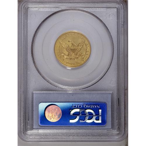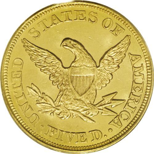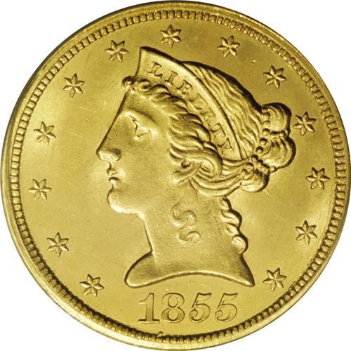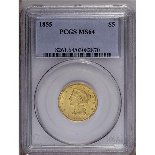 <B>1855 $5 MS64 PCGS.</B></I> MPD-001. Breen-6614. A misplaced date variety, the top of a 1 peers from the denticles between the 18 in the date. This is a remarkably smooth near-Gem that possesses consistent khaki-gold color. Intricately struck across most of the devices. The horizontal shield lines, the lovelock, and the curl near the ER in LIBERTY are the only design elements not sharply impressed by the dies. Marks are virtually absent, although Liberty's profile is clashed between the olive branch and the eagle's beak. Satin luster is plentiful, and the eye appeal is unassailable. Liberty half eagles from the final decades of the long-lived type are plentiful in quality Mint State grades, but it is a different matter for their No Motto predecessors, which are rarely found in near-Gem quality.