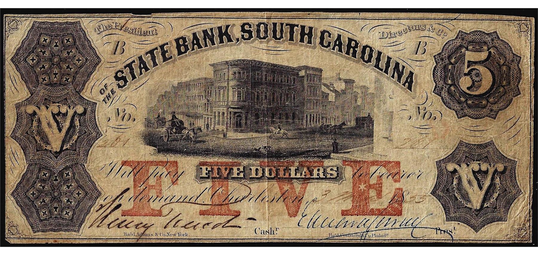 One 1855 $5 The State Bank of South Carolina Charleston Obsolete Note.