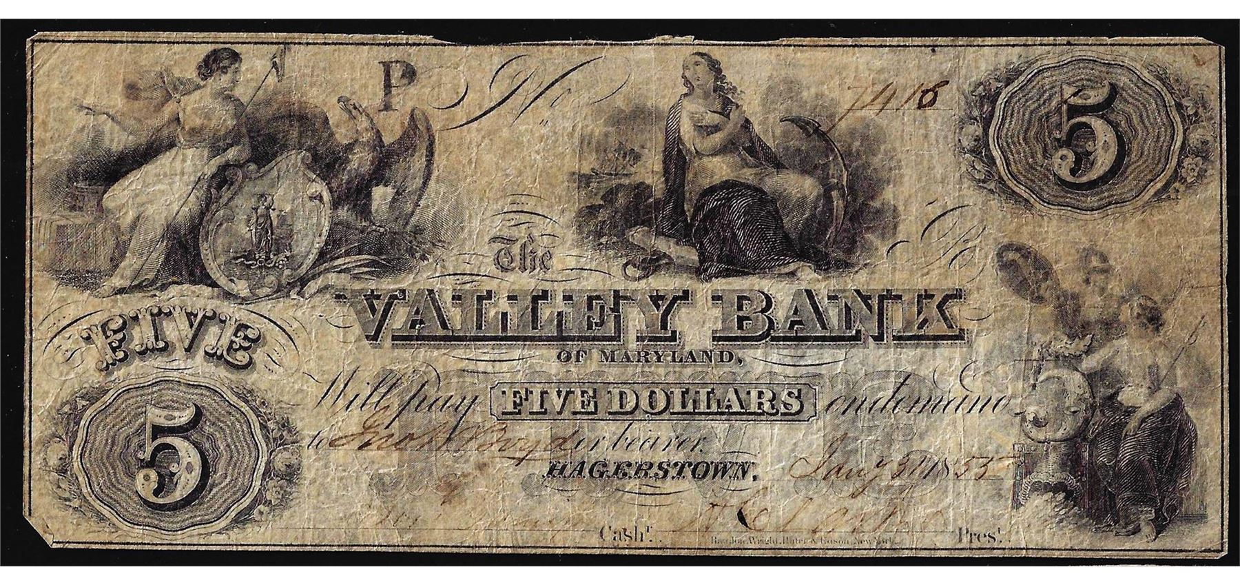 One 1855 $5 The Valley Bank of Maryland Hagerstown Obsolete Note.
