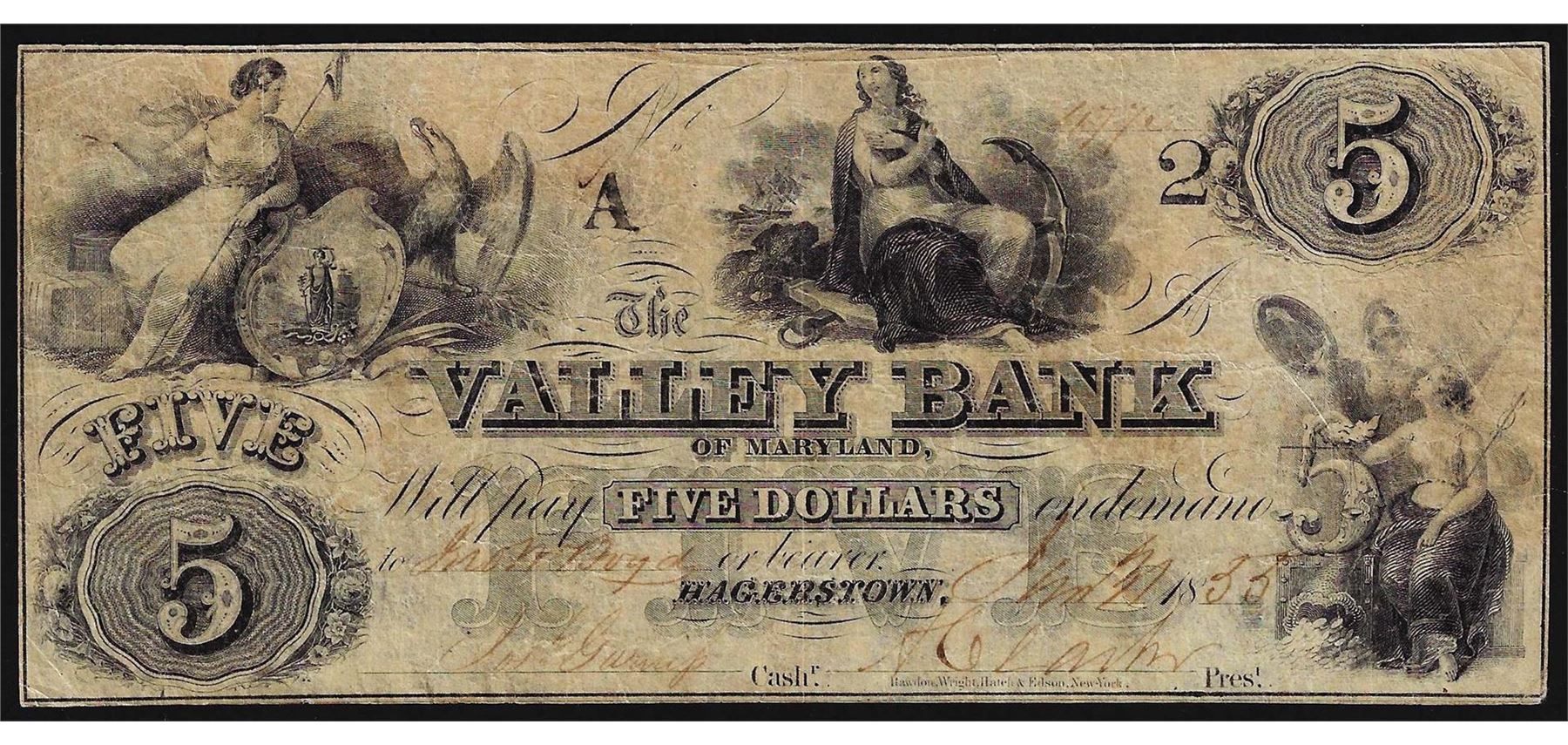 One 1855 $5 The Valley Bank of Maryland Obsolete Note.