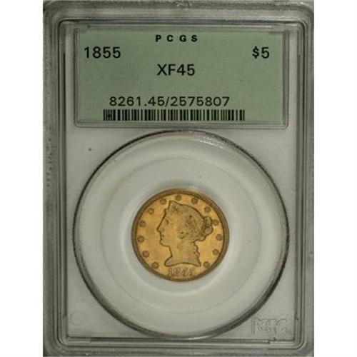 <B>1855 $5 XF45 PCGS.</B></I> PCGS Population (22/92). NGC Census: (19/180). Mintage: 117,098. Numismedia Wsl. Price for NGC/PCGS coin in XF45: $252. (#8261)<BR><BR><B>Coin Engraver:</B> Christian Gobrecht<BR><BR><b>Shipping:</b> Coins & Currency (<a target="_blank" href="http://www.heritageauctions.com/common/shipping.php">view shipping information</a>)