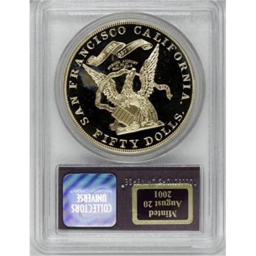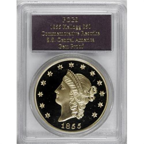 <B>SSCA Relic Gold Medal "1855" Kellogg & Co. Fifty Dollar Gem Proof PCGS.</B></I> A shining simulated modern restrike of the Kellogg & Co. 1855-dated design, boldly impressed with excellent contrast. This California Historical Society-associated piece has an incused inscription just above the eagle, noting that it was struck on August 20, 2001. Made from melted Kellogg & Humbert ingots recovered from the <I>S.S. Central America.</B></I><BR><BR><b>Shipping:</b> Coins & Currency (<a target="_blank" href="http://www.heritageauctions.com/common/shipping.php">view shipping information</a>)