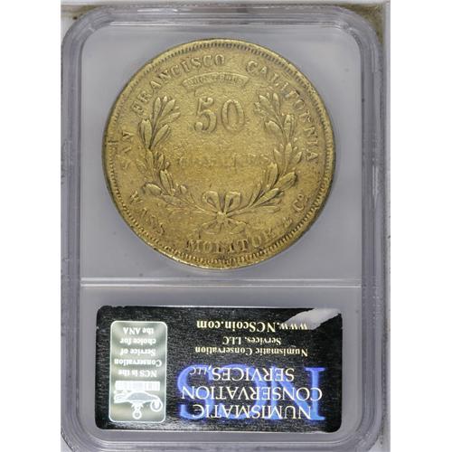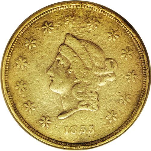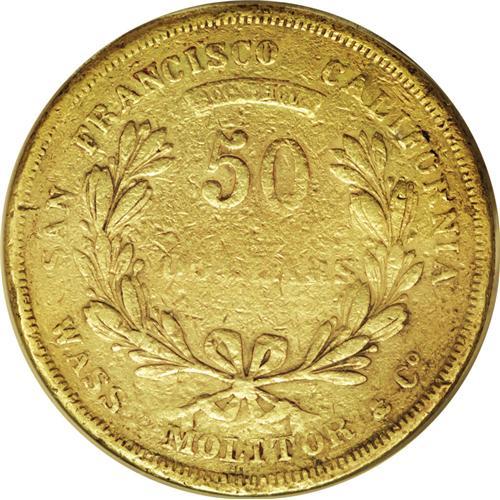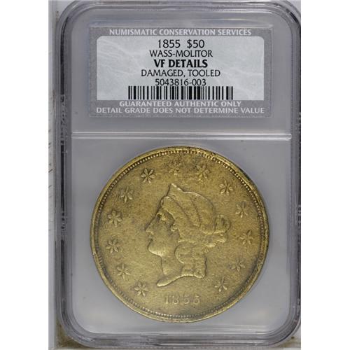 <B>1855 $50 Wass Molitor Fifty Dollar--Damaged, Tooled--NCS. VF Details.</B></I> K-9, R.5. Wass and Molitor were among the most respected issuers of territorial gold coins. Both were Hungarian miners who had been exiled by the Austrian government. The partnership of these two men represents how successful partners and mergers work. Each brought complementary talents to their company. According to Donald Kagin: "Wass's knowledge of mining, chemistry, and mineralogy combined with Molitor's ability at assaying, smelting, and refining created one of the finest assaying firms in California." He goes on to explain, "One of the drawing cards of this firm was that they paid off their depositors in 48 hours instead of the eight days usually required by the United States Assay Office."<BR> Few survivors remain of this successful California private minter. This particular piece has seen extensive use in the channels of commerce. Each side is also peppered with numerous small abrasions, and the lower obverse rim appears to have been worked on. Even wear, except for the word DOLLARS on the reverse, which is weaker than the other design elements.<BR><BR><b>Shipping:</b> Coins & Currency (<a target="_blank" href="http://www.heritageauctions.com/common/shipping.php">view shipping information</a>)