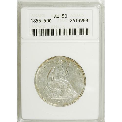 <B>1855 50C Arrows AU50 ANACS.</B></I> NGC Census: (3/91). PCGS Population (12/64). Mintage: 759,500. Numismedia Wsl. Price: $260. (#6281)<BR><BR><b>Shipping:</b> Coins & Currency (<a target="_blank" href="http://www.heritageauctions.com/common/shipping.php">view shipping information</a>)