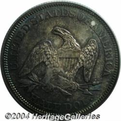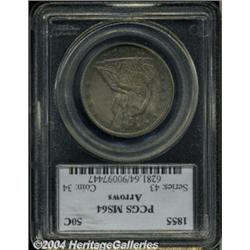 <B>1855<50C> Arrows MS64 PCGS.</B></I> Deep ocean-blue and olive-green colors grace the margins, while the centers offer blended lilac and peach hues. A gently shimmering and well struck near-Gem with a clean reverse and only a lightly marked obverse. The No Motto Arrows type was produced for just two years, which further fuels the demand for the very scarce high grade survivors. Population: 13 in 64, 6 finer (3/04). <BR><BR><B>Important notice:</B> Heritage usually auctions material at the rate of 200-250 lots per hour. On some occasions eBay Live bid software or the Internet may not be able to keep up with the pace of the auction. We recommend placing a realistic absentee bid now as insurance to avoid disappointment. Occasionally the auctioneer may eliminate or reject an eBay Live bid, and the auctioneer may also reopen a lot after the close of the eBay live bidding (usually because we missed an audience bid), and may reject your bid even if it shows you as the winning bidder. By bidding via eBay Live, you agree that Heritage may award the lot to another bidder at its sole discretion under the circumstances described above or any other reasonable circumstances. Since eBay bids are not shown to us until we open the lot on the floor, we treat those bids just like floor bids. In most cases the floor responds before the eBay bid is presented to us, due to Internet lag time, so for consistency we have made it a policy that floor bids are always considered first over tie eBay live bids. Also please note that all Heritage lots purchased through eBay Live carry a 20% Buyer's Premium. Please make sure you read the Terms and Conditions before you bid. </span></font></tr></table></td></tr></table>