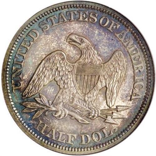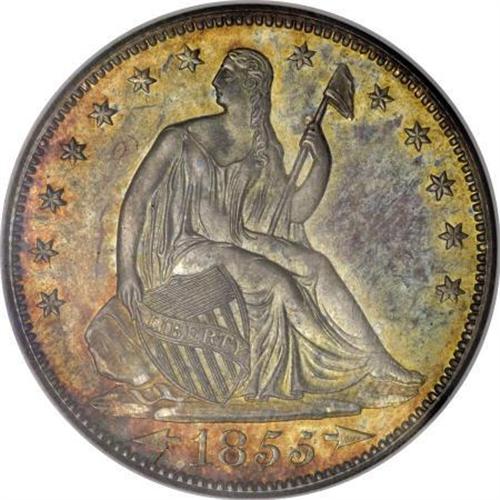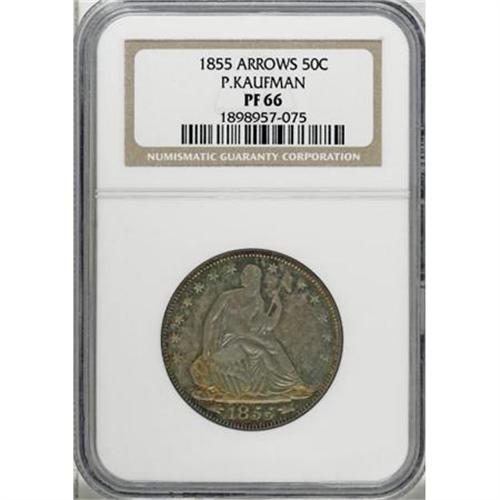 <B>1855 50C PR66 NGC.</B></I> Ex: P. Kaufman. The Kaufman 1855 proof half dollar is the finest known Normal Date specimen. Previous researchers differ on the number of surviving specimens. Randy Wiley and Bill Bugert, in their <I>Complete Guide to Liberty Seated Half Dollars</B></I>, suggest possibly 20 Normal Date pieces are known, while Walter Breen (1988) says there may be 12 coins extant. <BR> We feel that the above estimates of 1855 Normal Date proof half dollar survivors are somewhat high. NGC and PCGS have certified seven examples, and an analysis of auction appearances of which we are aware results in five separate specimens, and two additional coins that may be duplicates. Readers should be aware that we are unable to locate auction appearances of three PCGS-graded pieces, two with Cameo designations; moreover, some Normal Date coins were likely described as 1855/54 proof halves, and vice versa, in previous catalog appearances: <BR><B><BR> 1. PR66 NGC. The Kaufman coin</B></I>. Baltimore '93 Auction (Superior, 7/1993), lot 427, but unlisted as such on the NGC insert.<BR><B> 2. PR65 NGC. </B></I>John Jay Pittman (David Akers, 5/1998), lot 1549; Richmond Sale III (David Lawrence Rare Coins, 3/2005), lot 1798.<BR><B> 3. PR65 NGC.</B></I> Pre-Long Beach Elite Auction (Superior, 5/2003), lot 2574<BR><B> 4. PR63 NGC.</B></I> Pre-Long Beach (Superior, 10/2000), lot 4397.<BR><B> 5. PR62 NGC.</B></I> Pre-Long Beach (Superior, 10/2000), lot 4398. Catalogers say Ex Harry W. Bass, Jr. specimen.<BR><BR>Additional Appearances<BR> A. Gem Brilliant Proof. Empire State Collection (Stack's, 1/1997), lot 577.<BR> B. Brilliant Proof. Reed Hawn Collection (Stack's, 8/1973), lot 185.<BR> C. Proof. Brand-Lichtenfels I (Kreisberg-Schulman, 2/1961), lot 1840.<BR><BR> A captivating array of iridescent yellow-gold, sky-blue, lavender, crimson, and orange-gold patination adorns the Cameo-like obverse of the Premium Gem Kaufman half, while a ring of turquoise clings to the reverse borders, changing to dappled tan-gray and turquoise in the central areas. An attentive strike sharpens the design features, save for minor softness in a couple of the star centers. Close inspection reveals both sides to be devoid of mentionable marks. A shallow unpolished area, as minted, between the D of DOL. and the branch stem and a toning spot between star 5 and Liberty's shoulder enabled us to pedigree the Kaufman.<BR><I>From The Phil Kaufman Collection of Early Seated Proof Sets, Part Three.</B></I><BR><BR><B>Coin Engraver:</B> Christian Gobrecht<BR><BR><b>Shipping:</b> Coins & Currency (<a target="_blank" href="http://www.heritageauctions.com/common/shipping.php">view shipping information</a>)