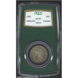 1855/54 50C Arrows AU50 PCGS. FS-5, Breen-4858. The borders have sea-green and gold patina. A sharpl