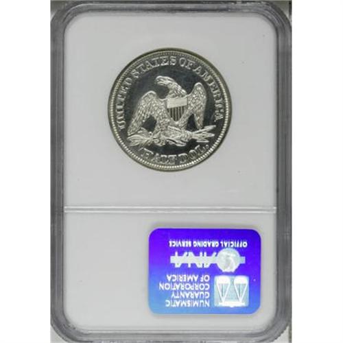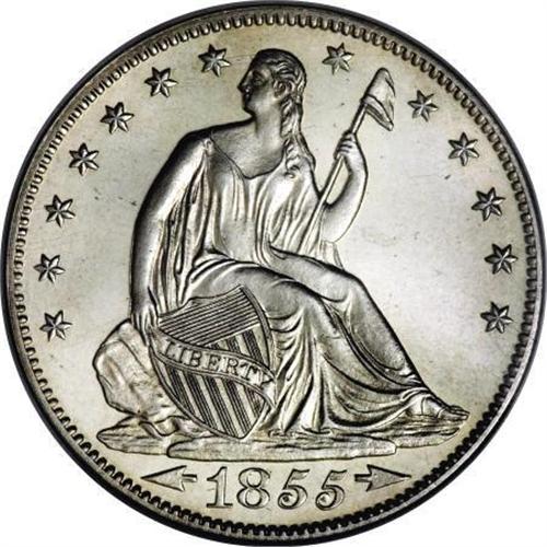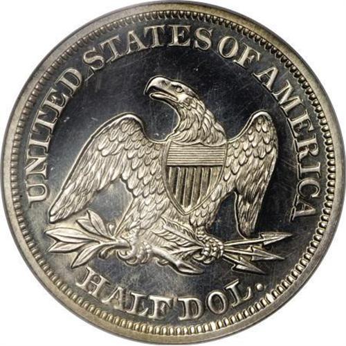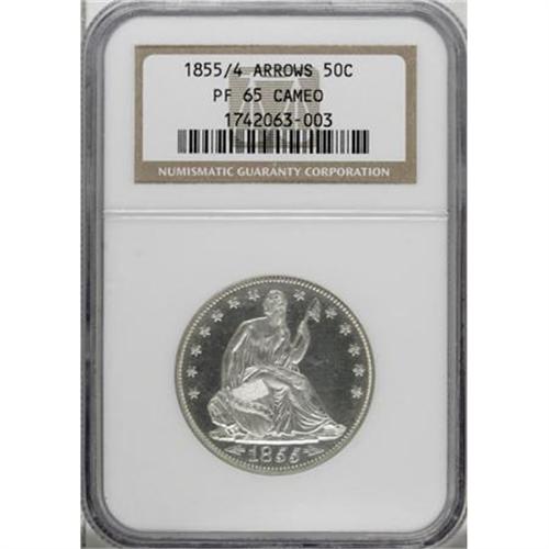 <B>1855/54 50C PR65 Cameo NGC.</B></I> The 1855/54 proof half dollar from the Phil Kaufman Collection is the <I>only</B></I> example of this issue assigned the Cameo designation by either NGC or PCGS. The rarity of this overdate cannot be overstated. Walter Breen (1989) could only account for three specimens, and Randy Wiley and Bill Bugert (1993) say at least three examples are extant. It is our belief that a few more pieces have survived, but not many more! NGC and PCGS have certified 11 1855/54 proof halves, some undoubtedly resubmissions.<BR> As we mentioned in the prelude to the 1855 Normal Date proof half dollar roster, some Normal Date coins were likely described as overdates, and vice versa, in previous catalog appearances. That said, our research results in the following listing:<BR><B><BR> 1. PR65 Cameo NGC. The Kaufman specimen.</B></I> We are unable to definitively match this piece with any of the following.<BR><B> 2. PR65 PCGS. </B></I>Norweb Collection (Bowers and Merena, 11/19880, lot 3166; Baltimore '93 Auction (Superior, 7/1993), lot 428. Superior catalogers say "Minor spot or roughness between NI of UNITED."<BR><B> 3. PR64 PCGS. </B></I>Rarities Sale (Bowers and Merena, 8/1996), lot 137; Dr. Juan XII Suros Collection of U.S. Overdate Coinage (Superior, 2/1999), lot 200; October 2000 Pre-Long Beach (Superior, 10/2000), lot 4378; Long Beach Sale (Heritage, 9/2002), lot 6855.<BR><B> 4. PR63 PCGS.</B></I> Chicago Sale (Superior, 8/1991), lot 516.<BR><B> 5. PR63 NGC.</B></I> Jules Reiver Collection (Heritage, 1/2006), lot 21324. The reverse photo shows a mark between the beak and left facing wing.<BR><B> 6. PR61 PCGS.</B></I> Richard Allen Collection (Heritage, 2/2001), lot 7822. Is this the "impaired" example that Breen (1989) says was once owned by Ted Clarke?<BR><BR> Additional Appearances<BR> A. PR65 NGC. The Benson Collection III (Goldberg Coins, 2/2003), lot 548; New York Connoisseur's Collection (American Numismatic Rarities, 3/2006), lot 771.<BR><BR> Delightful field-device cameo contrast appears on both sides of this Kaufman Gem proof. Untoned surfaces benefit from a well executed strike, resulting in completeness on the frosted design elements, further highlighting their variance with the mirrored fields. A faint unpolished area is visible in the right obverse field to the right of Liberty's elbow, as minted. Remnants of the underdate are evident under the final two digits. A pleasing coin that will be an excellent fit in a Seated Liberty proof collection.<BR><I>From The Phil Kaufman Collection of Early Seated Proof Sets, Part Three.</B></I><BR><BR><b>Shipping:</b> Coins & Currency (<a target="_blank" href="http://www.heritageauctions.com/common/shipping.php">view shipping information</a>)
