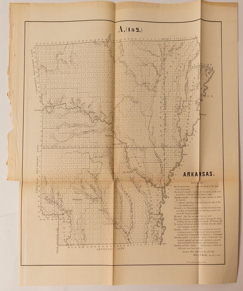 Dated 1855 surveyor's office Little Rock. Litho by A. Hoen & Co. A, (1&2). Some toning on edges, 1" of left edge is missing. 18.75" x 18". Date: Location: Arkansas HWAC # 54327