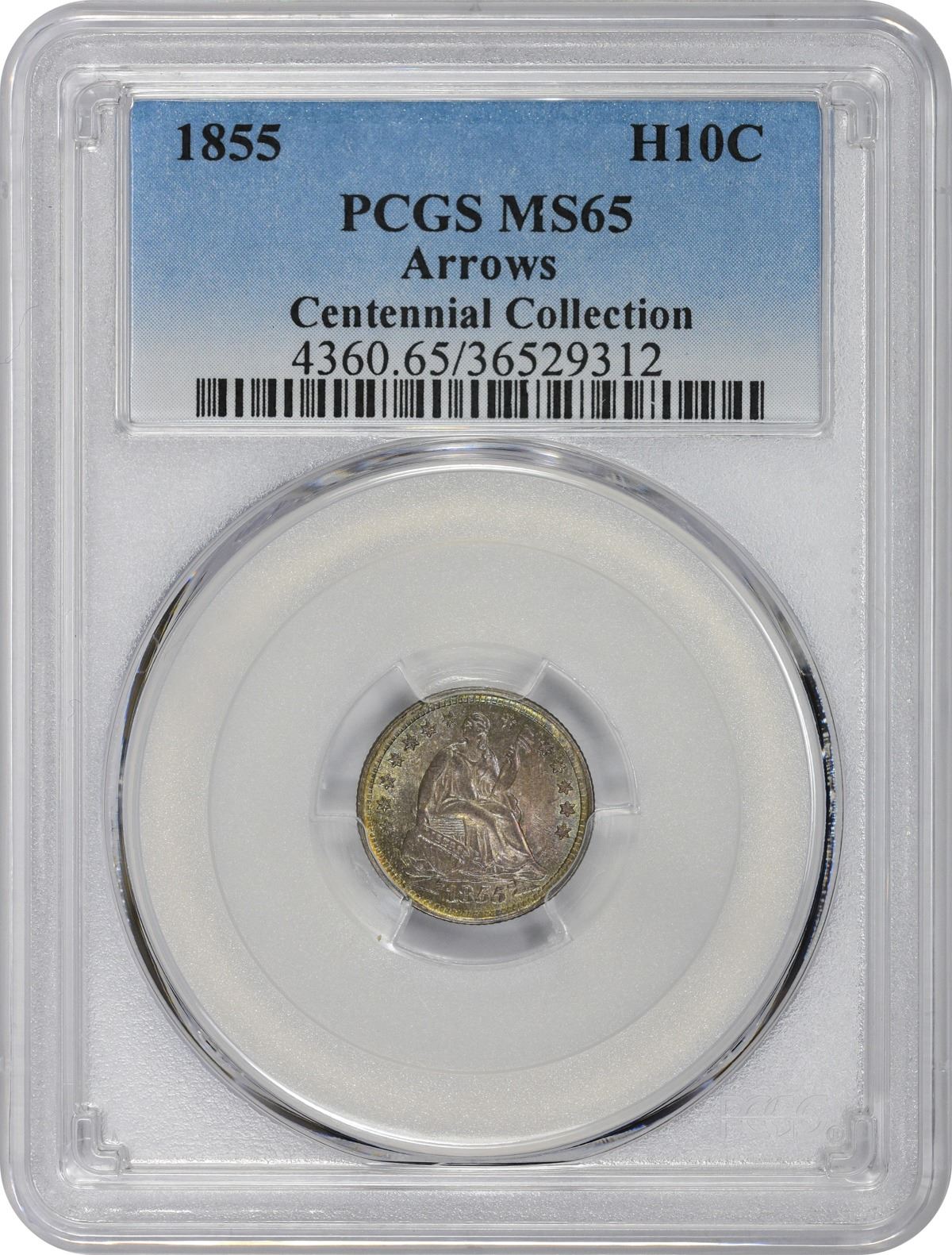 If beautiful and original toning is your cup of tea, you are on the right track with this frosty half dime. The lustrous surfaces glow with pale silver-lilac and blue iridescence acquired through 164 years of careful stewardship. Sharply struck from noticeably clashed dies; this specimen shows an E from the reverse at Liberty’s pole arm, and a rim-to-rim die crack that runs from 3 to 8 o’clock on the reverse. Undeniably choice, this specimen is what MS-65 is all about!