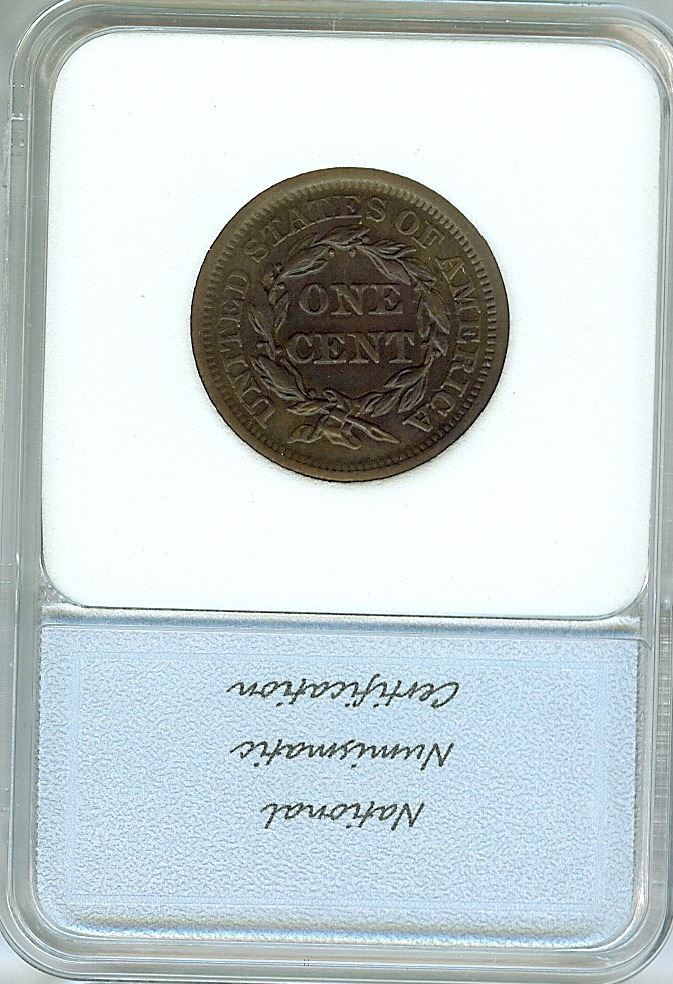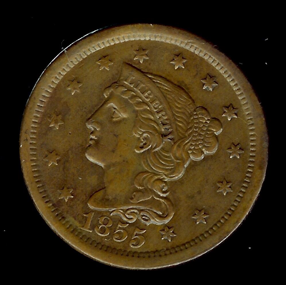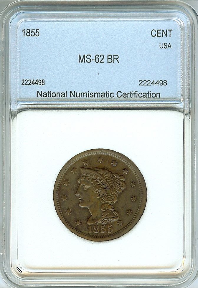 1855 BRAIDED HAIR LARGE CENT NNC MS-62 BROWN