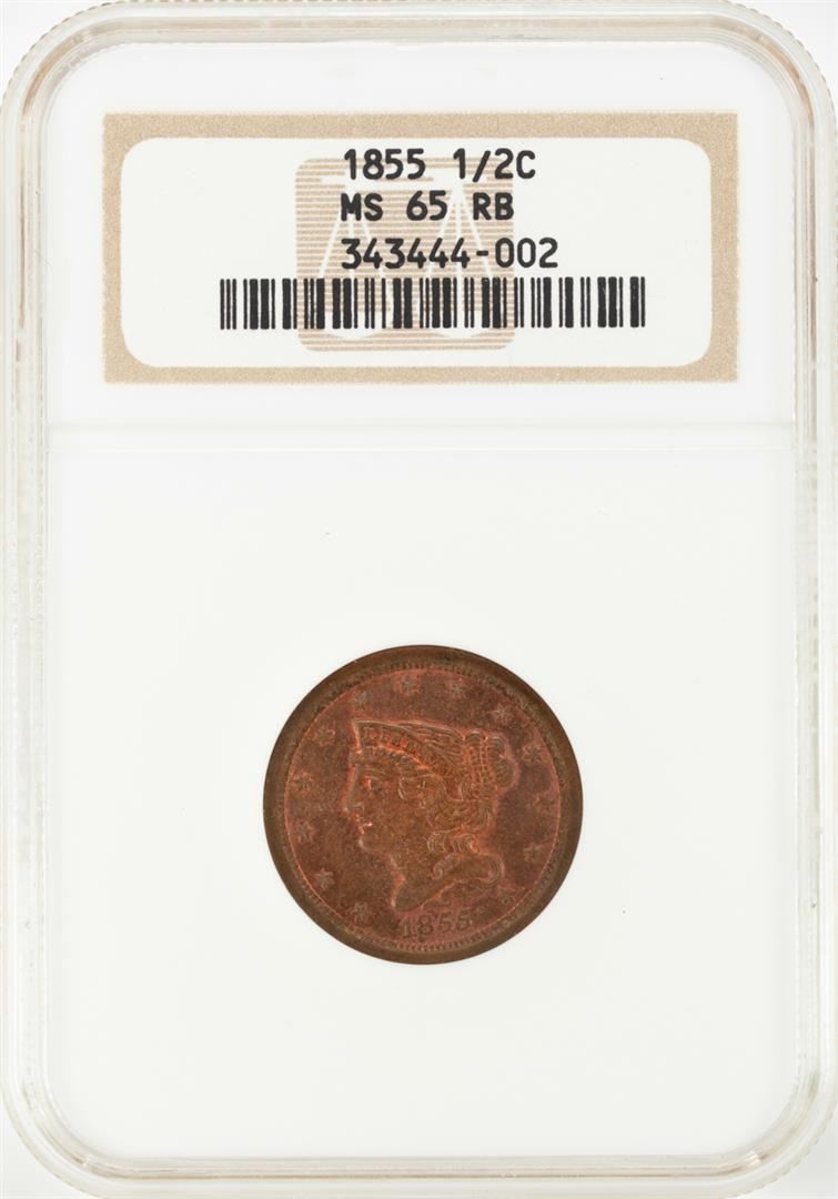 One 1855 Braided Hair Half Cent Coin NGC MS65RB. NGC Certified.