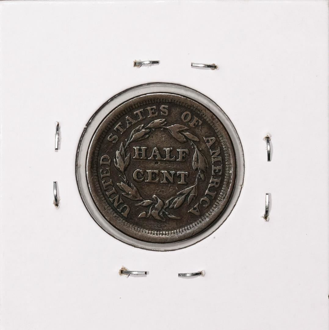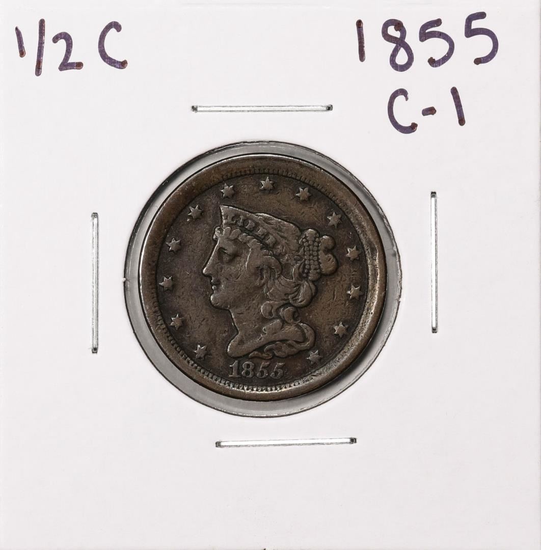 One 1855 C-1 Braided Hair Half Cent Coin.