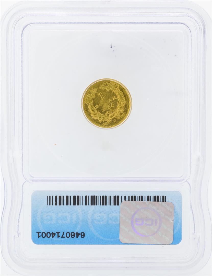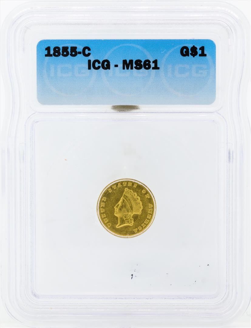 One 1855-C $1 Indian Princess Head Type II Gold Dollar Coin ICG MS61. ICG Certified.