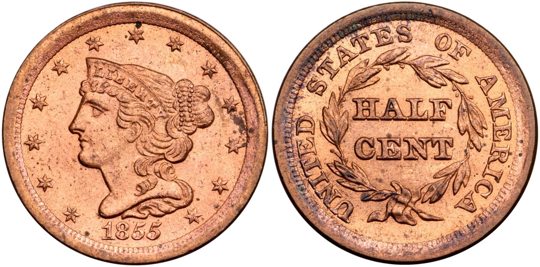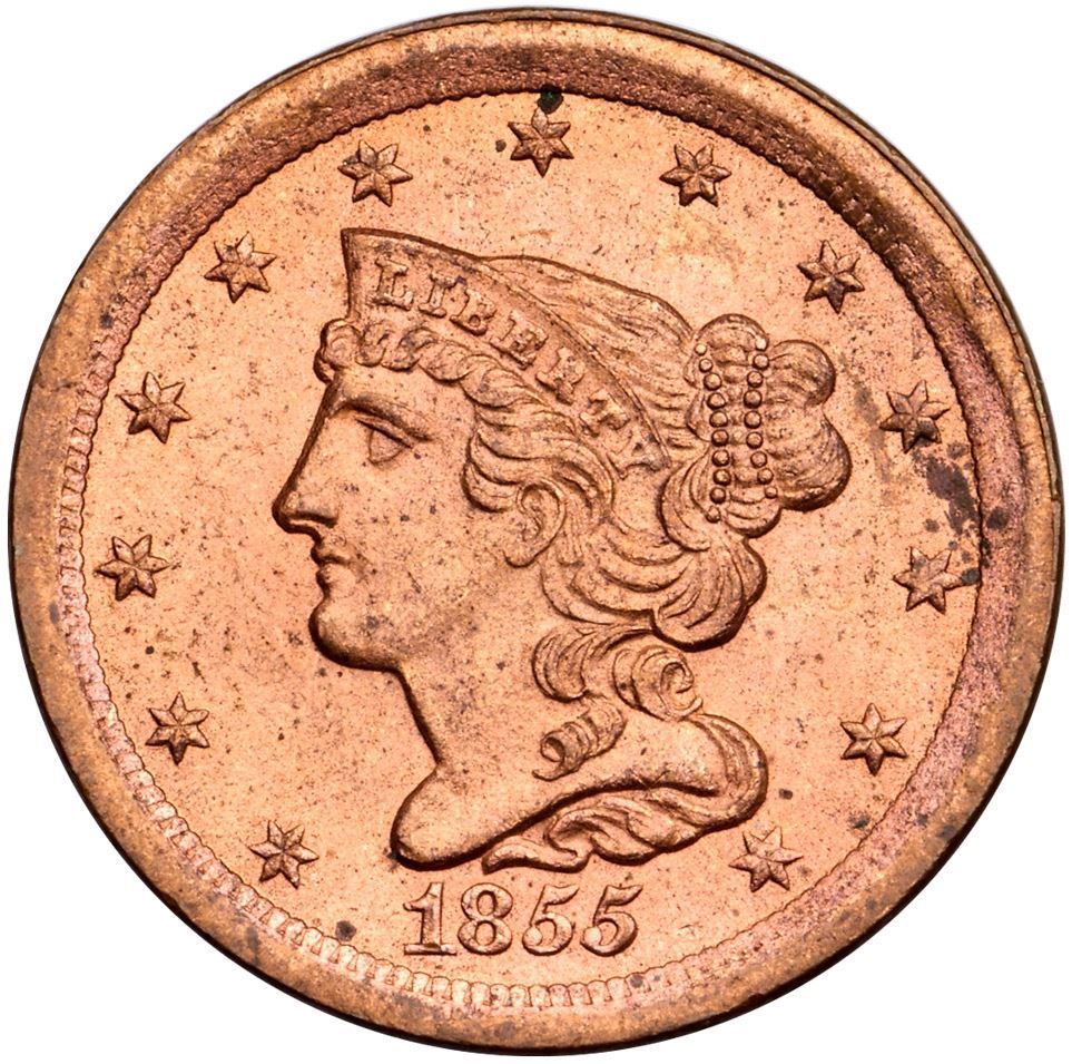 1855 C-1 R-1 MS62Absolutely brilliant full red example with an arc of steel toning around the reverse dentils. A near choice GEM example if not for the scattered carbon specks on the obverse, most notable around star 10. Brilliant full cartwheel luster. Manley state 1.0. Removed from an NGC MS64RD holder (1840813-009 label included).Certificate Number: Pedigree: Ex; Col. Steve Ellsworth 4/26/2006 - Bob Kebler Collection