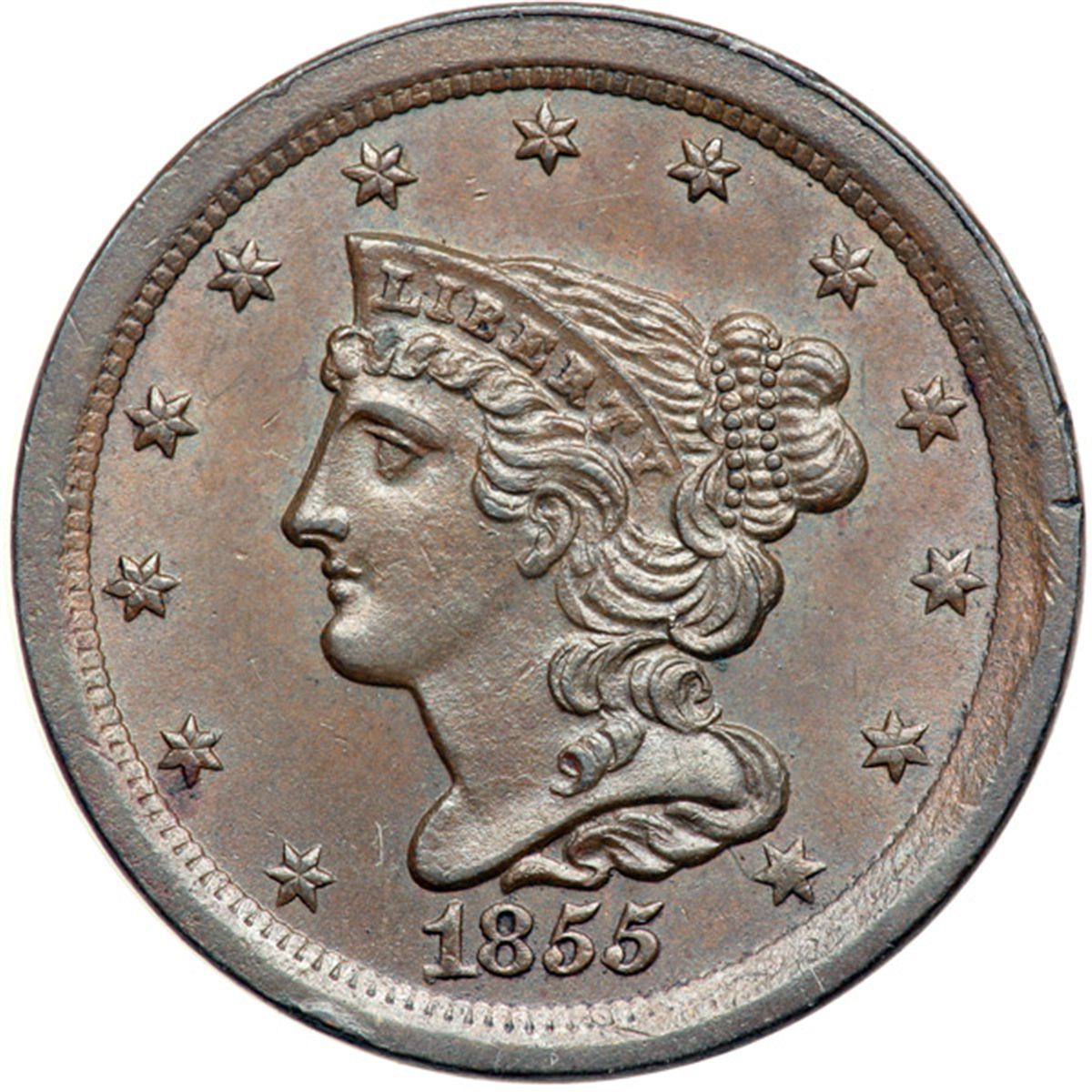 1855 C-1 R1 MS60. Lustrous light chocolate and steel with a vertical swipe of reddish chocolate toning right of T in CENT. Satiny mint frost covers the fields and protected areas. A very light rim bruise just left of the date is the only notable sign of contact. E-MDS.