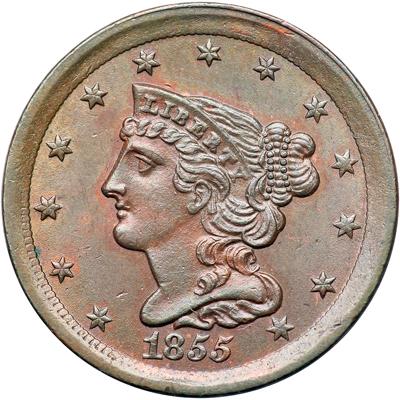 1855 C-1 R1. MS-60. Lustrous light olive brown with very faded mint color showing in protected areas. The surfaces are satiny and void of any notable marks. MDS. Sharply struck except for the dentils, which are mostly smeared, as usual for this year.