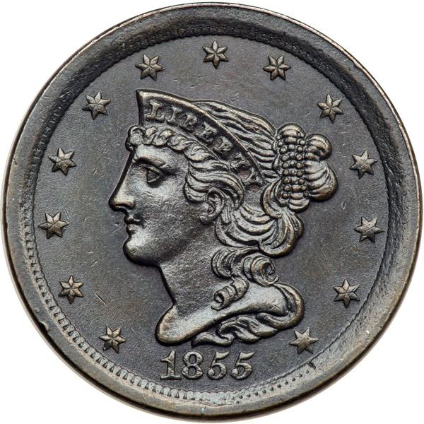 1855 C-1 R1 MS60. Glossy dark olive and steel. The toning is darker than you like to see on a mint state copper, but there are no marks or other defects. MDS.