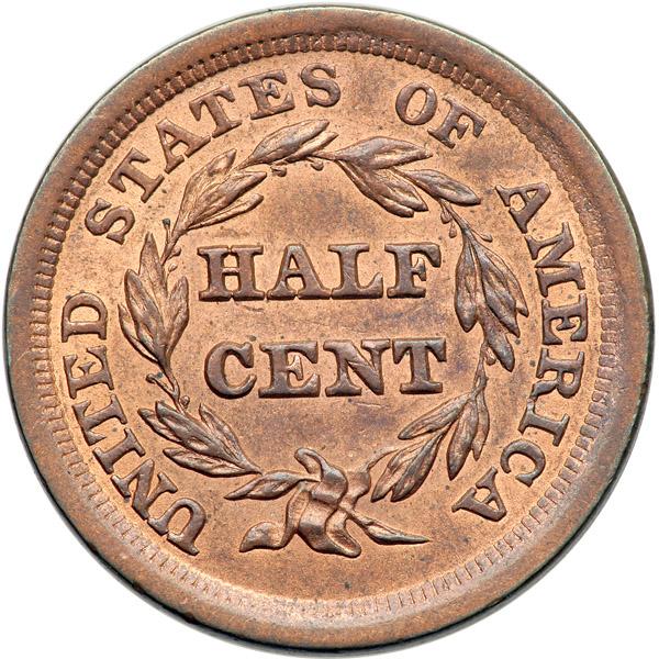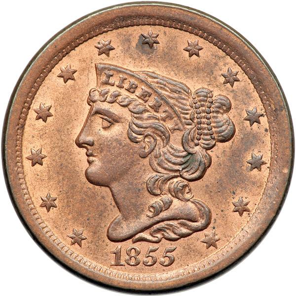 1855 C-1 R1 MS63+. Frosty mint red fading to light steel brown with half of the red remaining on both sides. Would rate a higher grade except for a spot of darker toning hidden in the hair curl right of the ear and a smaller one nestled against the bottom of star 7. The reverse is gem, virtually flawless. Overall this piece is very close to MS64. MDS with microscopic radial die flowlines covering the fields creating the attractive cartwheel luster. Removed from an NGC slab graded MS64RB (NGC label included, #194655-001). Noyes photo #74328.