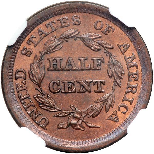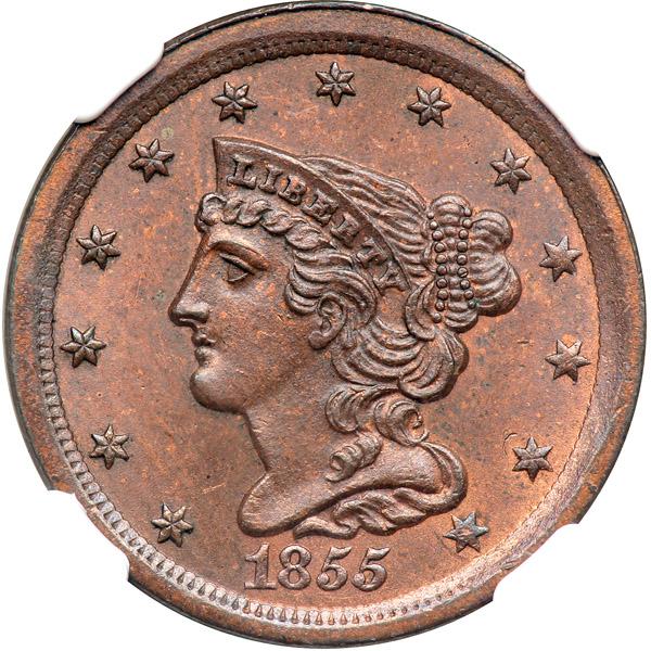 1855 C-1 R1. NGC graded MS-65 Red & Brown. Frosty mellowed mint red fading to chocolate and steel brown, about 20% of the faded mint red remaining, mostly on the reverse. Excellent eye appeal. The only marks are a small struck-through line off the upper left point of star 12 (caused by a piece of debris on the die), a tiny nick on the right foot of the A in HALF, and a speck of carbon nestled between the leaves under NI in UNITED. MDS. Our grade is MS63. The attribution is noted on the NGC label.