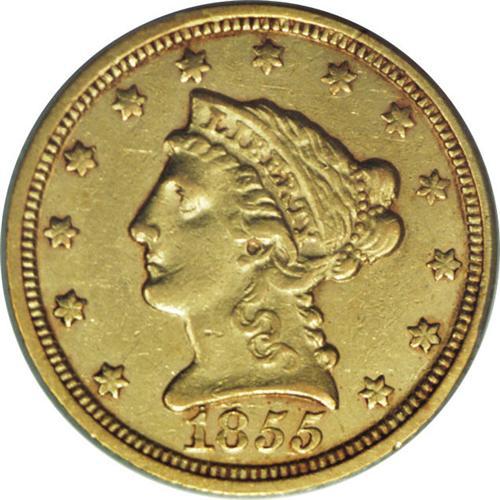 <B>1855-C $2 1/2 AU53 PCGS.</B></I> Variety 16-I. This low-mintage issue has sufficient value and a small enough actual population that resubmissions play havoc with the grading services' numbers. Regardless, the 1855-C quarter eagle is known as one of the scarcest such pieces of Charlotte gold, though its comparative rarity actually drops in higher grades. This well struck amber-gold example sports partially prooflike fields and well struck devices that have light highpoint wear. Minimally abraded and highly appealing. Population: 3 in 53, 24 finer (12/06).<BR><BR><b>Shipping:</b> Coin/Currency (<a target="_blank" href="http://www.heritageauctions.com/common/shipping.php">view shipping information</a>)