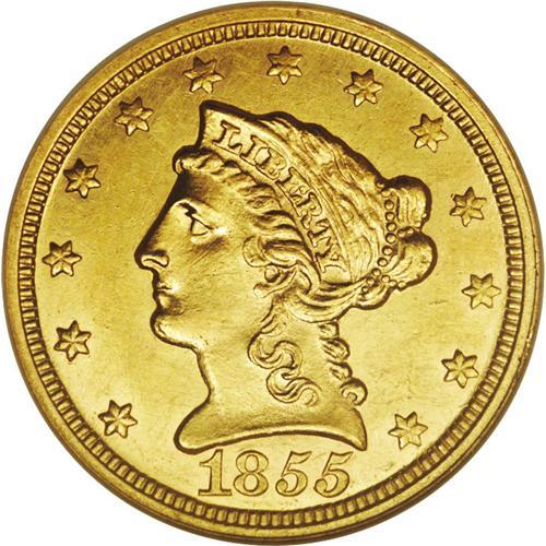 <B>1855-C $2 1/2 --Cleaned--ANACS. MS60 Details.</B></I> Variety 16-I. A modestly cleaned example of this elusive C-mint, one of a mere 3,677 pieces struck. While researching the statistics published in 1998 by Doug Winter in his book on Charlotte gold, we find the lower Condition Census includes coins at the MS60 level. Numerous hairlines somewhat dull the remaining luster.