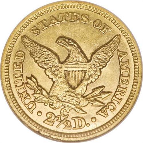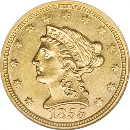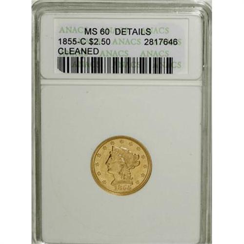 <B>1855-C $2 1/2 --Cleaned--ANACS. MS60 Details.</B></I> Variety 16-I. This low mintage Charlotte gold piece has nary a trace of wear, and the strike is above average, particularly on the portrait. Both fields are hairlined, and a thin strike-through is present above the eagle's head. The reverse is clashed near the eagle's wings, and a die break hugs the lower reverse rim.<BR><BR><B>Coin Engraver:</B> Christian Gobrecht<BR><BR><b>Shipping:</b> Coins & Currency (<a target="_blank" href="http://www.heritageauctions.com/common/shipping.php">view shipping information</a>)