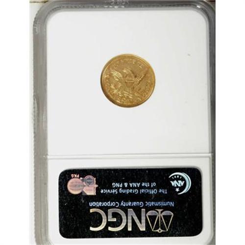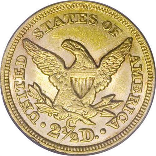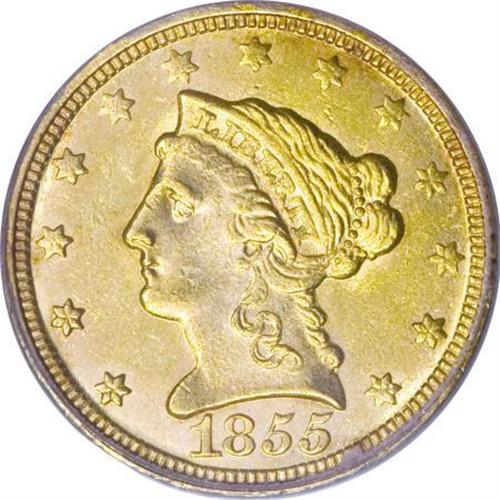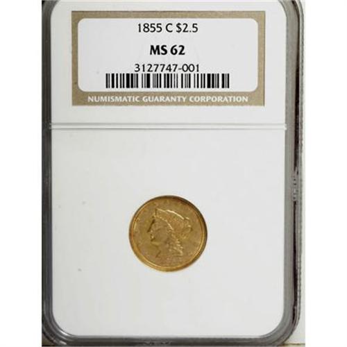 <B>1855-C $2 1/2 MS62 NGC.</B></I> Variety 16-I. "When I first saw this coin I let out an audible gasp," wrote Doug Winter. It is a breathtakingly lovely quarter eagle that is certainly one of the highlights of the Carolina Circle Collection. The overall quality of strike is better than average for the date, and the central obverse shows reasonably good detail. <BR> The best features of this coin, though, are its blazing luster with glowing, unbroken mint frost seen on both sides and lovely natural coloration that combines rich rose-gold and orange-gold hues. The surfaces are also far choicer than one might expect with just a few light nicks visible below a glass. There are no hairlines or mint-made planchet irregularities. This is a simply superb example of one of the rarest quarter eagles from this mint, and a coin that should really be carefully examined in person to determine its proper grade and true value.<BR> Only 3,677 pieces were struck, giving this the lowest mintage figure of any quarter eagle produced at the Charlotte Mint. The 1855-C remains one of the rarest dates in the series based on overall rarity, but it is slightly more available in higher grades than generally realized. We are aware of the following coins that grade Uncirculated:<BR><BR> -Bass II (Bowers and Merena, 10/1999), lot 476 ($41,400; as PCGS MS64). This coin no longer appears in the PCGS database; it was upgraded to MS65 at NGC but does not appear in the NGC Census figures.<BR><BR> -Private collection, Ex: Harry Laibstain, ca. 2000-2001. Graded MS64 by NGC.<BR><BR> -Carolina Circle Collection. Graded MS62 by NGC.<BR><BR> -Kansas Collection. Graded MS62 by PCGS.<BR><BR> -Heritage 2/2006, lot 2646 ($28,175). Graded MS62 by PCGS.<BR><BR> -Heritage 6/2007, lot 2179 ($25,300). Graded MS62 by NGC.<BR><I>From The Carolina Circle Collection.</B></I><BR><BR><B>Coin Engraver:</B> Christian Gobrecht<BR><BR><b>Shipping:</b> Coins & Currency (<a target="_blank" href="http://www.heritageauctions.com/common/shipping.php">view shipping information</a>)