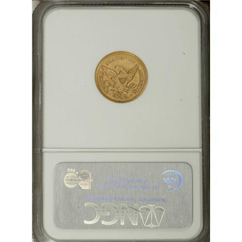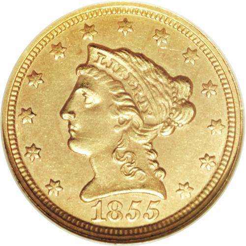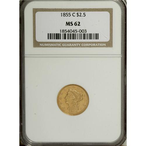 <B>1855-C $2 1/2 MS62 NGC.</B></I> Variety 16-I. This example survives from a mintage of just 3,677 coins, the lowest annual production total of any Charlotte Mint quarter eagle. Most of the design elements are sharply detailed, with weakness evident among the top stars on the obverse, and the eagle's left facing leg and right claw on the reverse. The planchet is exceptional for this issue. In fact, every aspect of this remarkable Mint State piece far exceeds the typical appearance of most known examples. Both sides have satiny luster with attractive honey-gold color that is accented by wisps of pale orange toning. A small rim break on the outer reverse rim below the denomination is a diagnostic feature of all genuine examples of this issue. Census: 4 in 62, 2 finer (4/07).<BR><BR><b>Shipping:</b> Coins & Currency (<a target="_blank" href="http://www.heritageauctions.com/common/shipping.php">view shipping information</a>)