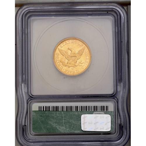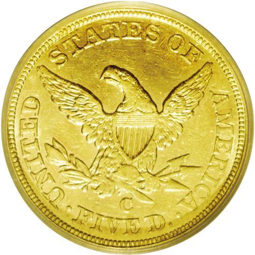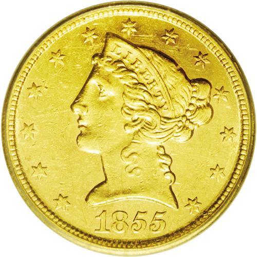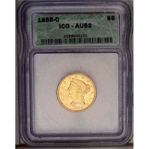 <B>1855-C<$5> AU53 ICG.</B></I> Variety 23-J. Substantial semi-prooflike luster illuminates this attractive Charlotte half eagle. A few small strike-throughs of mint origin do not distract the eye, and there are no obvious marks. As often seen, the eagle's neck and lower body show moderate striking softness.