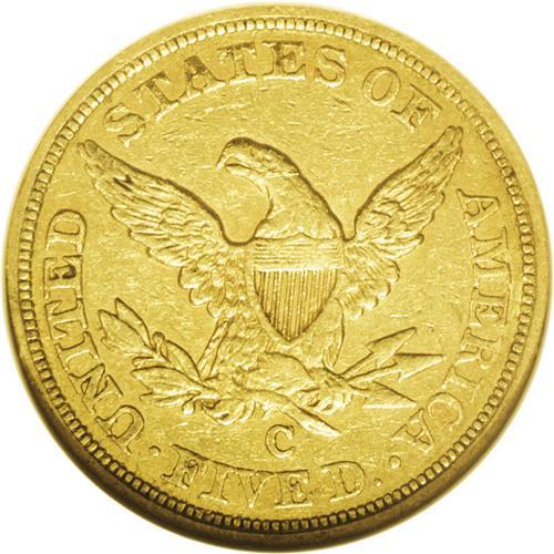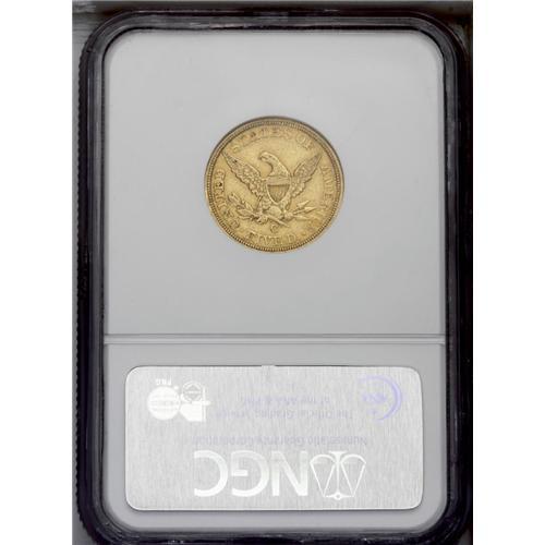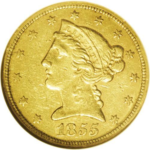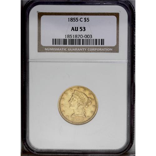 <B>1855-C<$5> AU53 NGC.</B></I> Variety 23-J. Glimpses of golden-brown luster visit the legends and devices. Small abrasions are distributed, but are of little relevance. A minor rim ding on the reverse at 8 o'clock will be missed by most observers. The eagle's neck, claws, and fletchings are soft, as usual for this Southern branch mint issue.