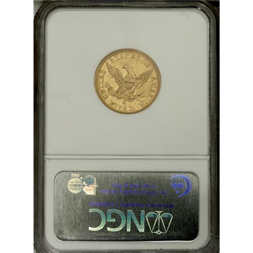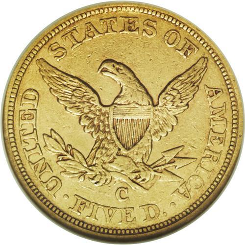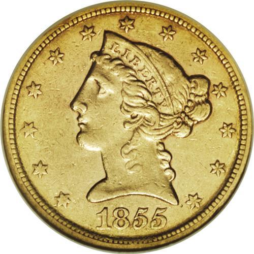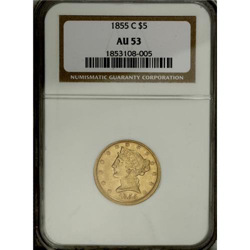 <B>1855-C $5 AU53 NGC.</B></I> Variety 23-J. This charming Charlotte Mint gold piece is less abraded than expected of the grade, and glimmers of luster brighten the borders and devices. The strike is good overall, with some softness noted on Liberty's hair above the coronet, and on the eagle's neck and fletchings.<BR><BR><b>Shipping:</b> Coin/Currency (<a target="_blank" href="http://www.heritageauctions.com/common/shipping.php">view shipping information</a>)