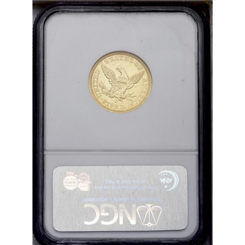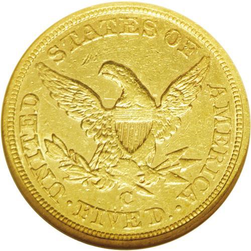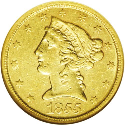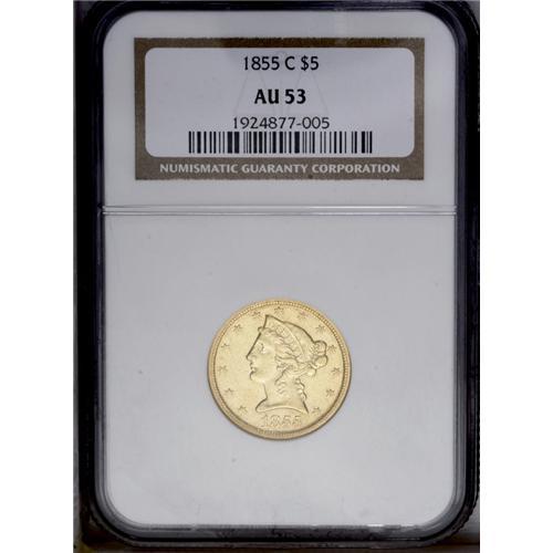 <B>1855-C<$5> AU53 NGC.</B></I> Variety 23-J, the only known dies. Both sides have brilliant yellow-gold color with considerable luster. Design weakness is noted at the typical locations, along the hairline on the obverse and near the claws on the reverse. The surfaces are lightly abraded. Total mintage for the issue was 39,788 coins, with about 150 of those remaining in existence today. At the time this coin was struck, five different Mints were operating around the country. The San Francisco Mint had only recently opened, and was now in its first full year of production. The various Mints were essentially regional operations, with Dahlonega and Charlotte producing coinage from gold found in that area, San Francisco responsible for most of the Western gold and silver, New Orleans for South American imports, and Philadelphia for everything else. <BR><BR><B>Important notice:</B> Heritage usually auctions material at the rate of 200-250 lots per hour. On some occasions eBay Live bid software or the Internet may not be able to keep up with the pace of the auction. We recommend placing a realistic absentee bid now as insurance to avoid disappointment. Occasionally the auctioneer may eliminate or reject an eBay Live bid, and the auctioneer may also reopen a lot after the close of the eBay live bidding (usually because we missed an audience bid), and may reject your bid even if it shows you as the winning bidder. By bidding via eBay Live, you agree that Heritage may award the lot to another bidder at its sole discretion under the circumstances described above or any other reasonable circumstances. Since eBay bids are not shown to us until we open the lot on the floor, we treat those bids just like floor bids. In most cases the floor responds before the eBay bid is presented to us, due to Internet lag time, so for consistency we have made it a policy that floor bids are always considered first over tie eBay live bids. Also please note that all Heritage lots purchased through eBay Live carry a 20% Buyer's Premium. Please make sure you read the Terms and Conditions before you bid. This lot is being auctioned in conjunction with a live floor auction by Heritage Galleries & Auctioneers. All final auction and invoice information will be supplied by Heritage Galleries & Auctioneers, and all other information should be considered preliminary. Lot:2728 <BR><BR><B>Winning Notification and Billing:</B> After the FINAL session in this auction is complete, Heritage will send e-mail and snail mail invoices. This process normally takes several days. All final auction and invoice information will be supplied by Heritage Galleries & Auctioneers, and all other information should be considered preliminary. <BR><BR>This auction will be conducted on a live auction floor and over the Internet through eBay Live. If you choose to place an absentee bid, please take a moment to <font color='#0000ff'><u><a href='http://pages.ebay.com/liveauctions/help/before/laabsentee.html'>learn how eBay Live absentee bidding works</a></u></font><font color='#000000'>