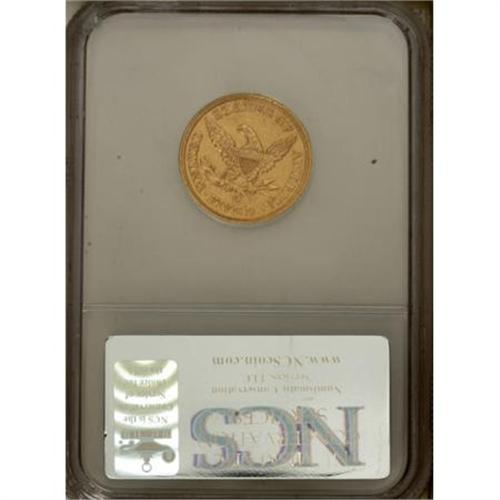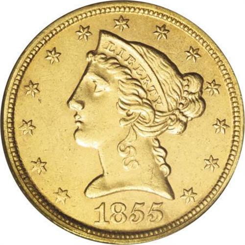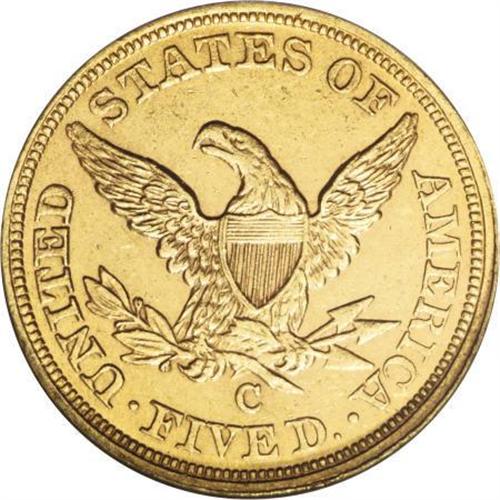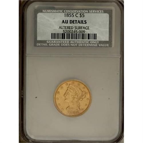 <B>1855-C $5 --Altered Surface--NCS. AU Details.</B></I> Variety 23-J. This is a saltwater coin with the sharpness of an Uncirculated piece. When PCGS and NGC first started grading, they would sometimes encapsulate saltwater Uncirculated branch mint gold coins with a net grade (a coin like the present one might have received an AU50 grade) but both services appear to no longer encapsulate these pieces. This is among the better saltwater Charlotte half eagles we have seen and we would not be surprised if it brought a price commensurate with a problem-free XF example. Sharply struck with minor field marks present.<BR><I>From The Carolina Circle Collection.</B></I><BR><BR><B>Coin Engraver:</B> Christian Gobrecht<BR><BR><b>Shipping:</b> Coins & Currency (<a target="_blank" href="http://www.heritageauctions.com/common/shipping.php">view shipping information</a>)