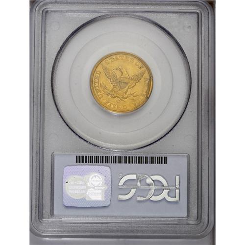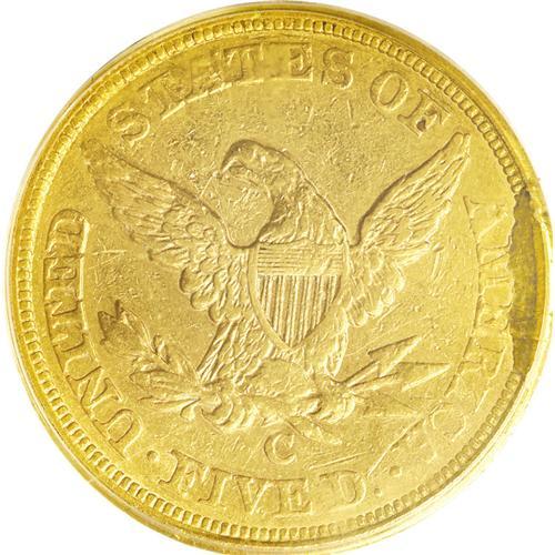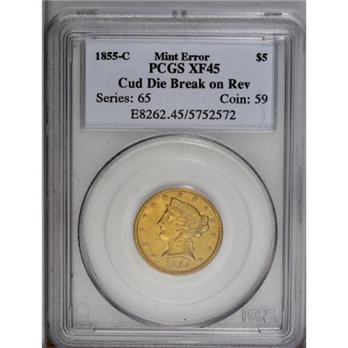 <B>1855-C<$5> Liberty Half Eagle--Cud Die Break on Reverse--XF45 PCGS.</B></I> Variety 23-J. A dramatic cud looms over the ME in AMERICA. The cud has parallel abrasions above the E. Glossy apricot surfaces display two moderate marks on the lower left obverse field. The 1855-C is a better date with a mintage of less than 40,000 pieces. Among the few hundred survivors, only about 5% display the prominent cud. Of special interest to collectors of Charlotte gold or the error collector who needs a representative from this scarce and popular Southern mint.<BR><I>From The Henderson Collection of U.S. Gold Errors.</B></I>