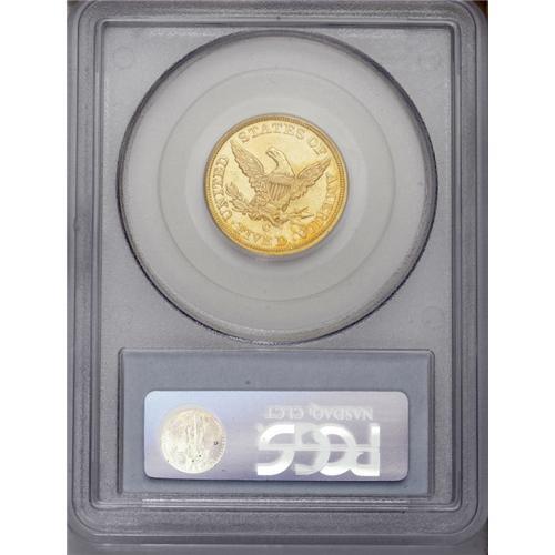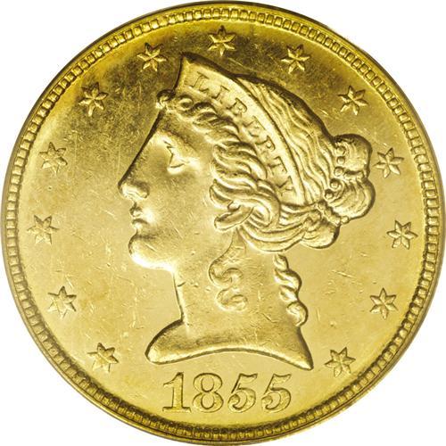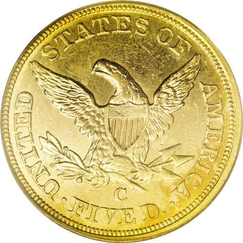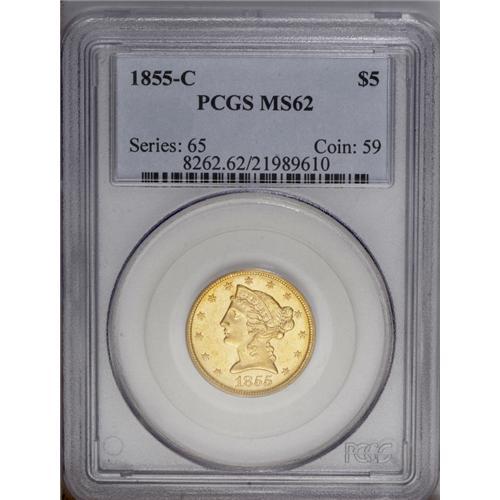 <B>1855-C $5 MS62 PCGS.</B></I> Variety 23-J. Both sides of this eye appealing Dahlonega five are mildly reflective except for a thin unfinished area about the peripheries. Field marks are evenly dispersed and generally light, although perhaps unfairly heightened by the coin's flashy mint luster. Blushes of orange patina are primarily confined to the lower reverse border. As with several other Uncirculated examples we have offered over the past decade, the striking details of the obverse are particularly bold while a touch of softness can be found on the eagle's neck feathers and right (facing) talons. Several low-end Mint State pieces have surfaced in recent years, but in MS62 and finer grades the 1855-C remains an extremely challenging issue. Population: 2 in 62, 1 finer (1/06).