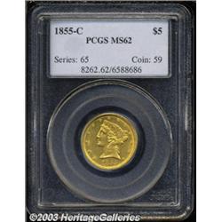 1855-C $5 MS62 PCGS. Variety 23-J, the only known dies. A solid Condition Census representative of this difficult C-mint Half Eagle which owes its rarity to a limited production of 39,789 pieces and heavy attrition during the turbulent Civil War years. The surfaces are noticeably prooflike in finish--an uncommon feature since most high grade examples display frosty luster. Both sides are overlaid in rich reddish-gold color that highlights the boldly struck devices. Only a few of the star centrils and the eagle's neck feathers on the reverse display some softness of detail. As a future identifier, a small group of abrasions is located under the eagle's left (facing) wing and above the wreath on the reverse. Sure to be one of the finest '55-Cs to be offered at auction for some time. Population: 1 in 62, 1 finer (10/03). Important notice: Heritage usually auctions material at the rate of 200-250 lots per hour. On some occasions eBay Live bid software or the Internet may not be able to keep up with the pace of the auction. We recommend placing a realistic absentee bid now as insurance to avoid disappointment. Occasionally the auctioneer may eliminate or reject an eBay Live bid, and the auctioneer may also reopen a lot after the close of the eBay live bidding (usually because we missed an audience bid), and may reject your bid even if it shows you as the winning bidder. By bidding via eBay Live, you agree that Heritage may award the lot to another bidder at its sole discretion under the circumstances described above or any other reasonable circumstances. Also please note that all Heritage lots purchased through eBay Live carry a 20% Buyer's Premium. Please make sure you read the Terms and Conditions before you bid.