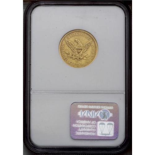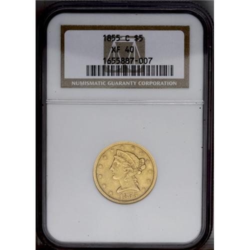 <B>1855-C<$5> XF40 NGC.</B></I> Variety 23-J. Vestiges of luster cling to selected areas of this problem-free straw-gold Charlotte Mint half eagle. The expected moderate softness of strike is noted on Liberty's curls and the eagle's neck. The wings and right side stars are sharp.